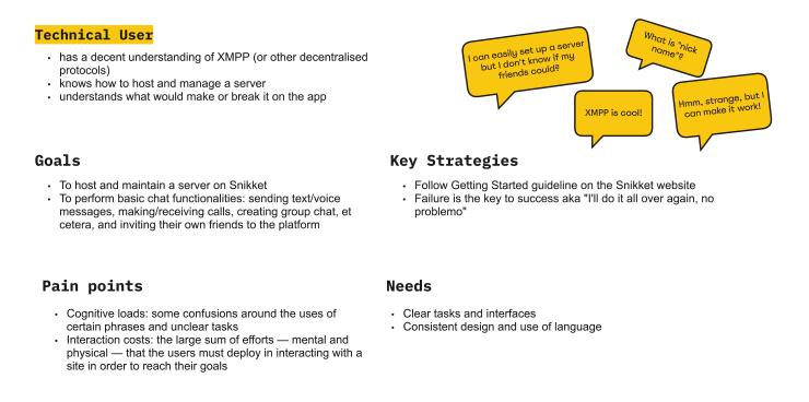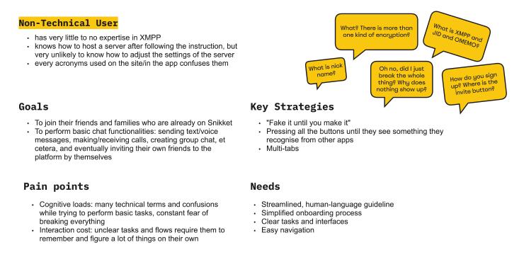 The Snikket onboarding process starts at different places depending on the users’ level of technical knowledge and their familiarity with XMPP. A non-technical user usually has their first interaction on the app, while a technical user might go to the website first and start with the Snikket Hosting platform. Because of this, it is important to deliver the right message, in the right place, at the right time. We had to keep in mind that this doesn’t mean packing in and presenting all the information to users at once - users don’t need to know all the technical information in order to perform a task. In some cases, it might be too technical for non-technical users and XMPP beginners to fully comprehend the differences between the variety of Snikket components such as instance, app, network, and server.