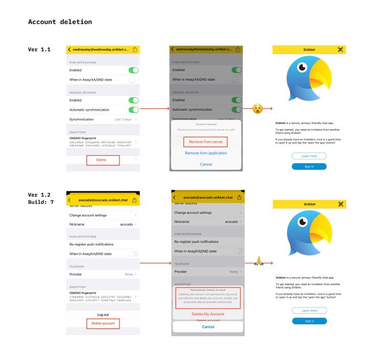 An effective onboarding process should prioritize what users need to do and know by highlighting the most important information in a timely manner. For example, the images below display a comparison of Snikket two different versions for the UI/UX design of account deletion. In version 1.1, there was no system confirmation of the deletion but two different options of account removal, none of which presented in a non-technical friendly manner. A small UX change in version 1.2 makes it a lot easier for users to perform their task. By eliminating the technical removal options and providing a confirmation message, users can avoid making an error (log-out versus delete) and focus on the task at hand.