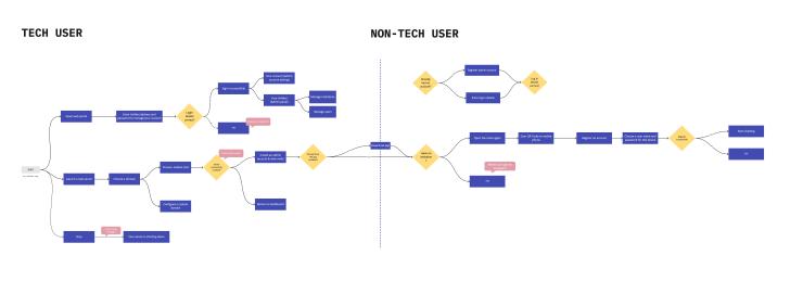 Most of the non-technical testers could not figure out how to install the app. Even if they did manage to download the app, they didn’t know how to start using it. The lack of clearly visible next steps makes it difficult for users to establish a workflow. Most users, including tech-savvy users, expected to be able to use the app right after installation. To address these challenges, we relied on our two personas — the non-technical user and the technical user. We mapped out both persona’s needs and pain points and then identified the similarities in their onboarding process.