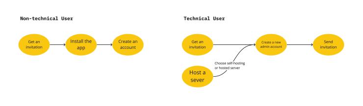 As technical users can create their own instance on Snikket, they are introduced to an entirely different workspace on Snikket (the web portal). After successfully creating a server, they can start sending invitations for others to join. Meanwhile, the non-technical users’ onboarding flow only starts after they have received an invitation and downloaded the application. A simple task such as signing in can get confusing here when a new user can’t create an account on the app and isn’t introduced to the web portal priorly: