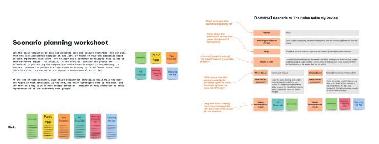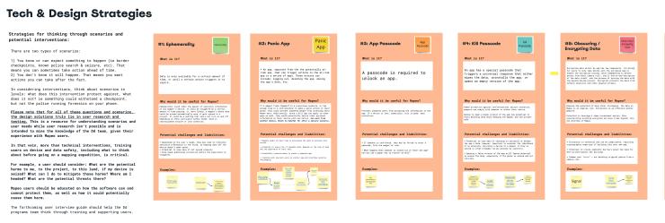 We created a large workspace in Miro that enabled the Dd team to think through the potential device seizure and loss scenarios their users face or may face and determine which of the identified design interventions made the most sense for Mapeo. The board included a synthesis of the Threat Modeling workshop findings, a section explaining each of the identified design interventions around device loss and seizure (with examples), and a section for in-depth scenario planning and pattern identification.