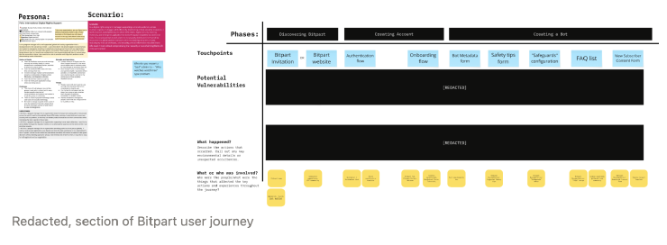 I used this as input to take a more process-based approach to understand the threats in the specific conversational flows and the larger arcs of user journeys. Using the Personas Non Grata, I stepped through both conversational flows and journeys to see exactly where and how a disaster could emerge from a threat actor at a specific interaction (i.e. site of vulnerability).
