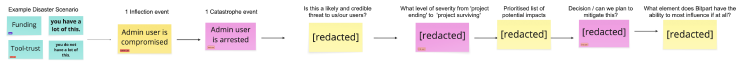 With those personas in mind, we continued on with the Throneless Tech team. We deliberately steered the focus away from the “easy” disasters—server crashes or widespread data breaches—and instead, focused the team on clear stress cases (i.e. catastrophes like arrests, device seizures, admin abductions, and funding cuts). As the team played the game, it focused on these “likely” catastrophes, threats, and vulnerabilities that surfaced across end users, admins, and maintainers—the platform’s whole human stack.