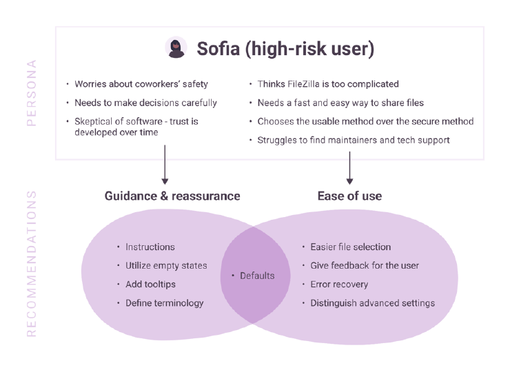 - As part of the OTF Usability Lab, Simply Secure worked with FileZilla Server to improve usability of the tool, specifically with high-risk users in mind. We conducted user research and gave design recommendations, which resulted in personas, an expert review, and new UI recommendations for creating a TLS certificate.