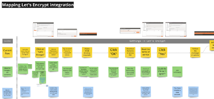 How we mapped the current process of adding a certificate using Let’s Encrypt and also UX issues we identified with these steps.