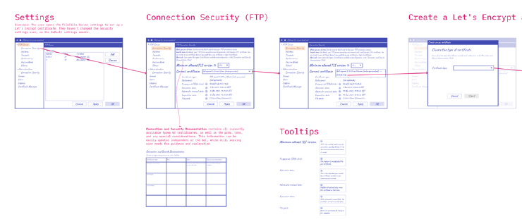 With the foundational work completed, in Phase 2 we prioritized the user experience of the security features and settings of FileZilla, specifically setting up a TLS certificate using the Let’s Encrypt service. We wanted this process to be accessible to a high-risk user type who might be new to FTP or not have access to dedicated IT advice. For this technical challenge, we used several tactics to fill in the gaps of our knowledge.