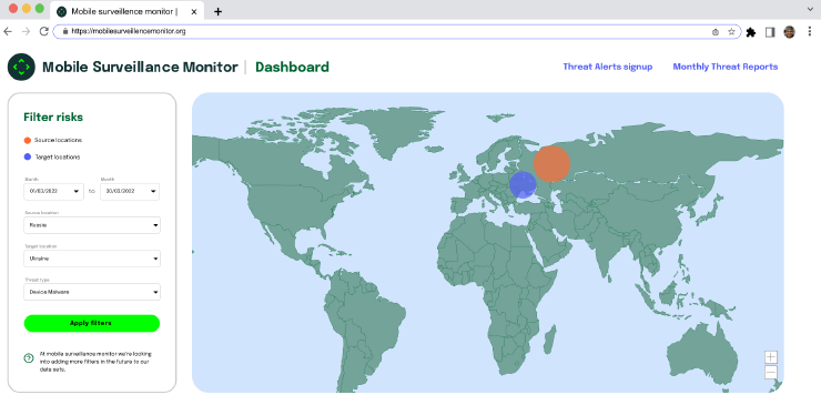 Surveillance on mobile devices is rampant globally, yet security researchers and everyday users alike struggle to access real data on surveillance threats and where they’re coming from. With support from the Open Technology Fund (OTF), we helped the brand new platform Mobile Surveillance Monitor (MSM) fill this gap by providing research and design support. This new tool is both a public resource that tracks mobile threats on a map-based dashboard, and a workbook which provides researchers with detailed charts and investigation tools to uncover new details about multiple types of threats.