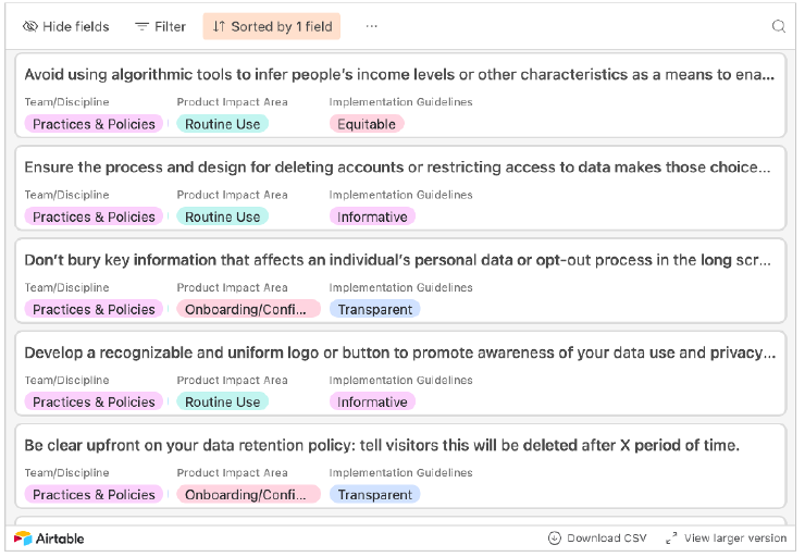 In addition to these guidelines, we synthesized recommendations from workshop contributors and a task force led by Sage Cheng of Access Now into a database of recommendations sortable by teams/discipline (e.g. user research, visual design), product areas (e.g. onboarding, errors), and guidelines (e.g. equitable, transparent).