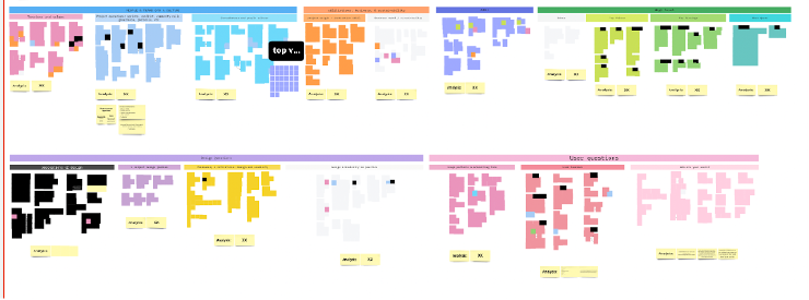 USER has presented our team with a challenge: how do we best do deep, human-centered research with a distributed team while working remotely and collaborating equitably? In previous projects, we’ve tried to stay ahead of the synthesis process by using what we call a “Debrief Synthesis Board’’ in Miro, where we have a grid-like structure that we can use after completing each interview to capture the most important ideas and findings. This method proved to be difficult in the face of such a wide-ranging and complex research topic. In the end, we organized over 1500 sticky notes over many rounds, into more than 25 categories!